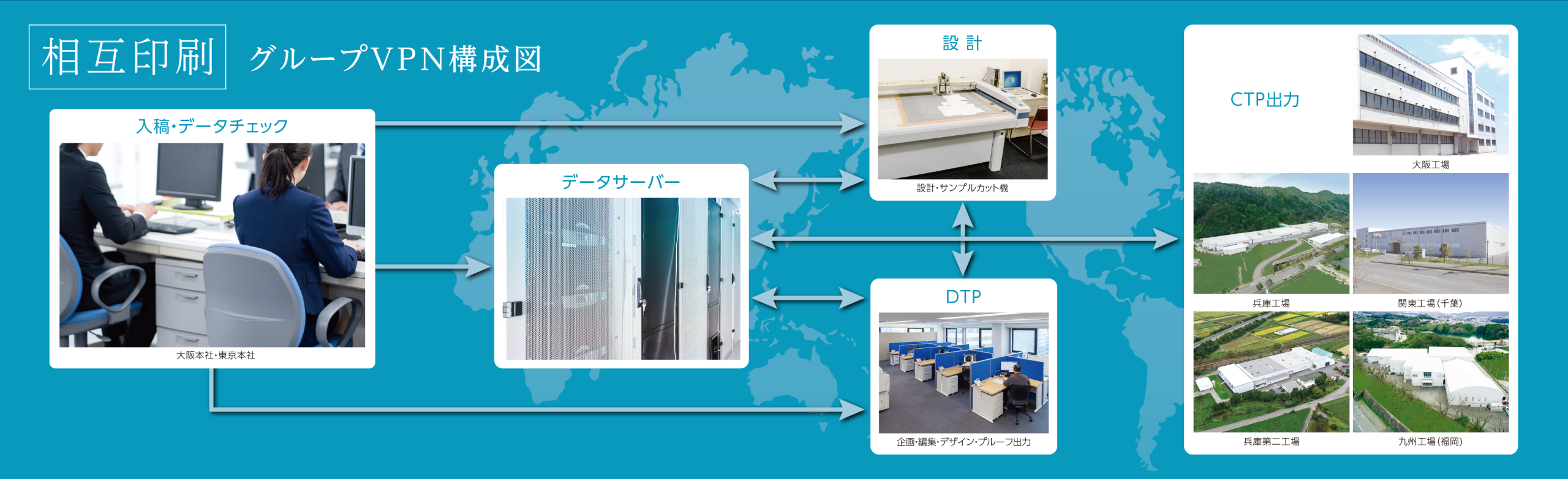 各工場に同一の生産設備を配置し、印刷に関するデータをそれぞれ関東圏、関西圏の2ヵ所で万全なセキュリティー管理のもとに保管し、冗長化を行っています。仮に一つの工場が被災により停止しても、直ちに代替生産工場にデータを転送することができるシステム(相互印刷グループVPN※ 下図参照)を備えていますので、どの工場においても同一水準の製品を生産・供給することが可能です。